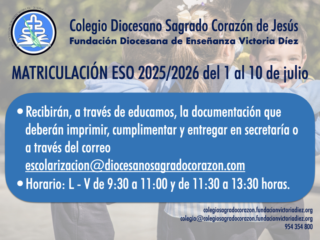 El Anexo VII podrá ser cumplimentado en la Secretaría Virtual de la Junta de Andalucía, mientras que toda la documentación restante deberá ser entregada al centro en horario de 9:30 a 11:00 y de 11:30 a 13:30 horas. También se podrá entregar de manera telemática debidamente cumplimentado, firmado y escaneado al correo electrónico escolarizacion@diocesanosagradocorazon.com